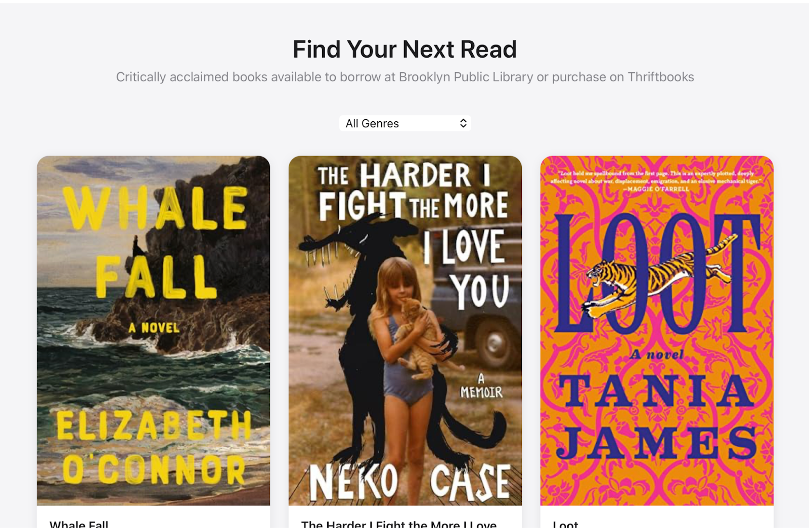 The tool is called "Great Reads Now!" and it does one thing well: shows me critically acclaimed books that are available right now at my library. No waiting, no forgetting why. It pulls titles from NPR's "Books We Love," the New York Times Best Books list, and AudioFile's best audiobooks. I can filter by genre, toggle between ebooks, audiobooks, and print, and hit "Spin Again" to get three random picks. Initially I had it show everything–that was too much.